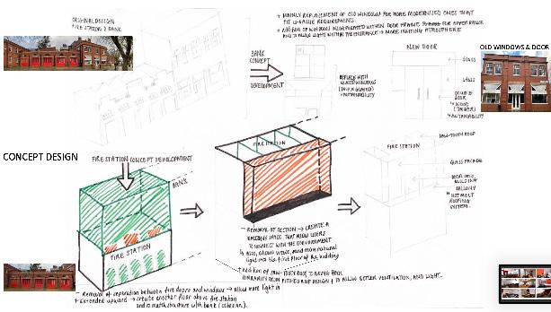 As a design proposition, the fire station must maintain a link to its original self with regard to the doors windows and preferably brick facade.