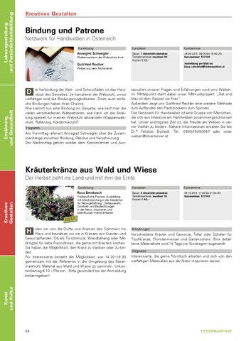 olen wir uns die Düfte und Aromen des Sommers ins Haus und bewahren wir sie in Kränzen aus Kräuter- und Gewürzpflanzen. Ob als Türschmuck, Wandbehang oder Mit bringsel für liebe FreundInnen, die gerne mit Kräutern kochen. Sie haben die Möglichkeit, den Kranz zu stecken oder zu bin den. Für Interessierte besteht die Möglichkeit, von 14.30–16.30 gemeinsam mit der Referentin in der Umgebung des Steier markhofs Material aus Wald und Wiese zu sammeln. Unkos tenbeitrag € 10.–/Person. Bitte gesondert bei der Anmeldung bekanntgeben!
