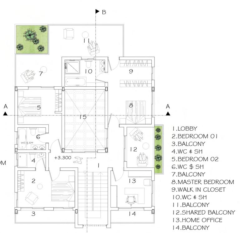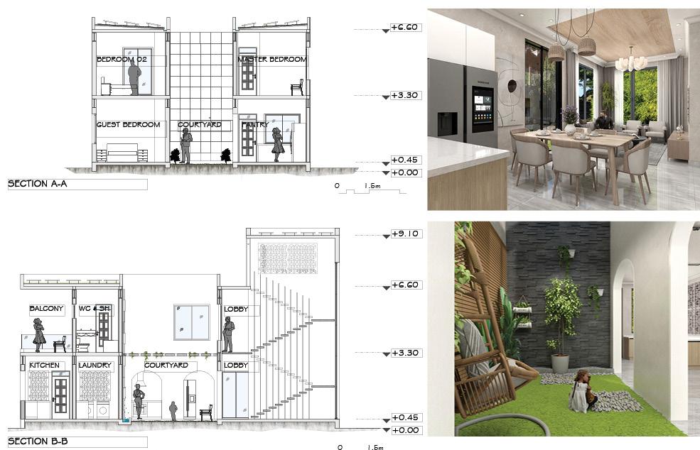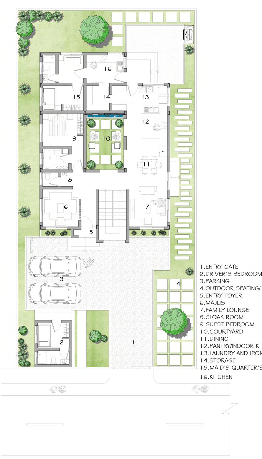 •Make the courtyard the central focus of the design, drawing inspiration from traditional Emirati architecture. And act as a natural ventilation system, promoting air circulation and creating a breathable environment.