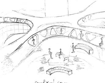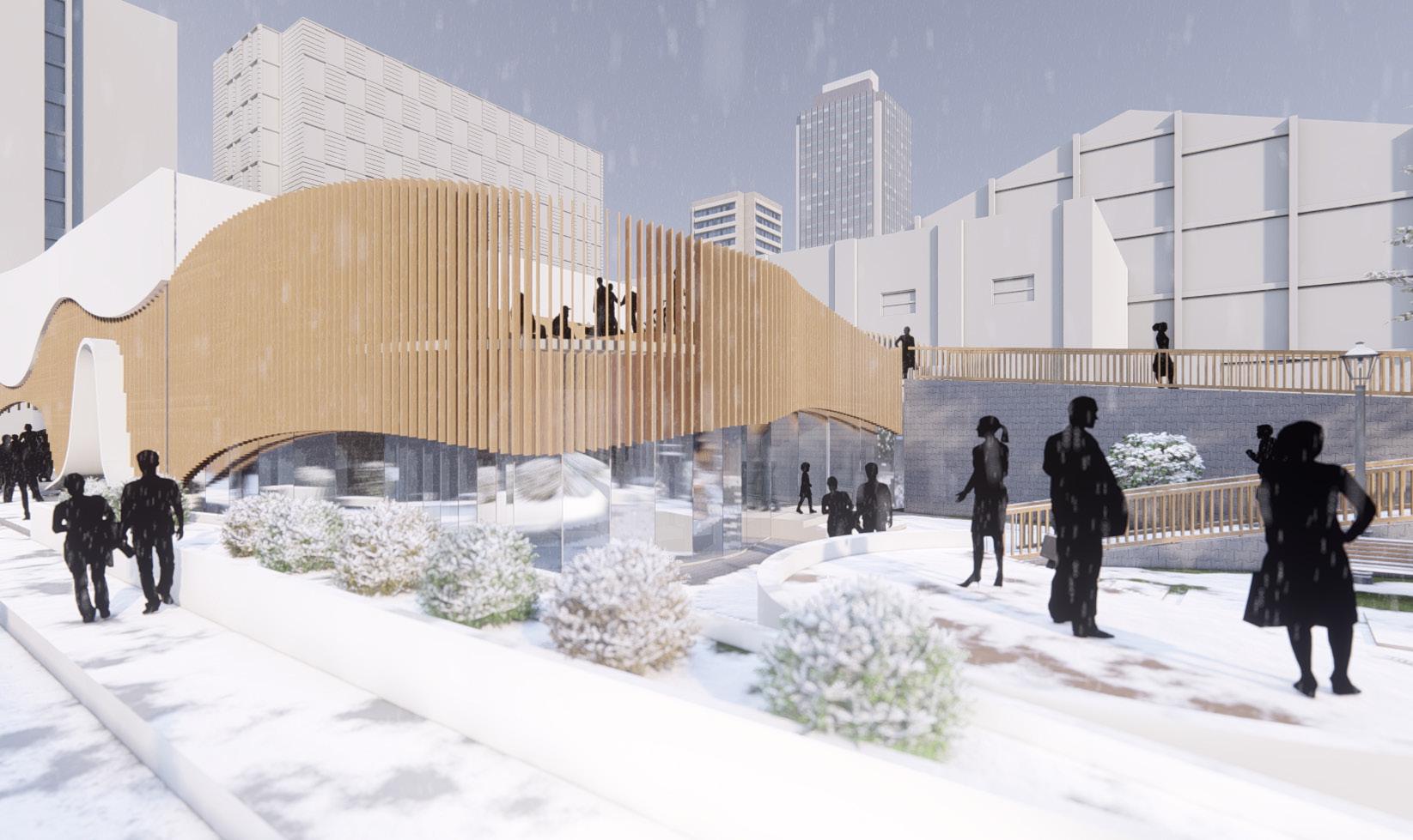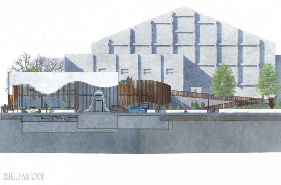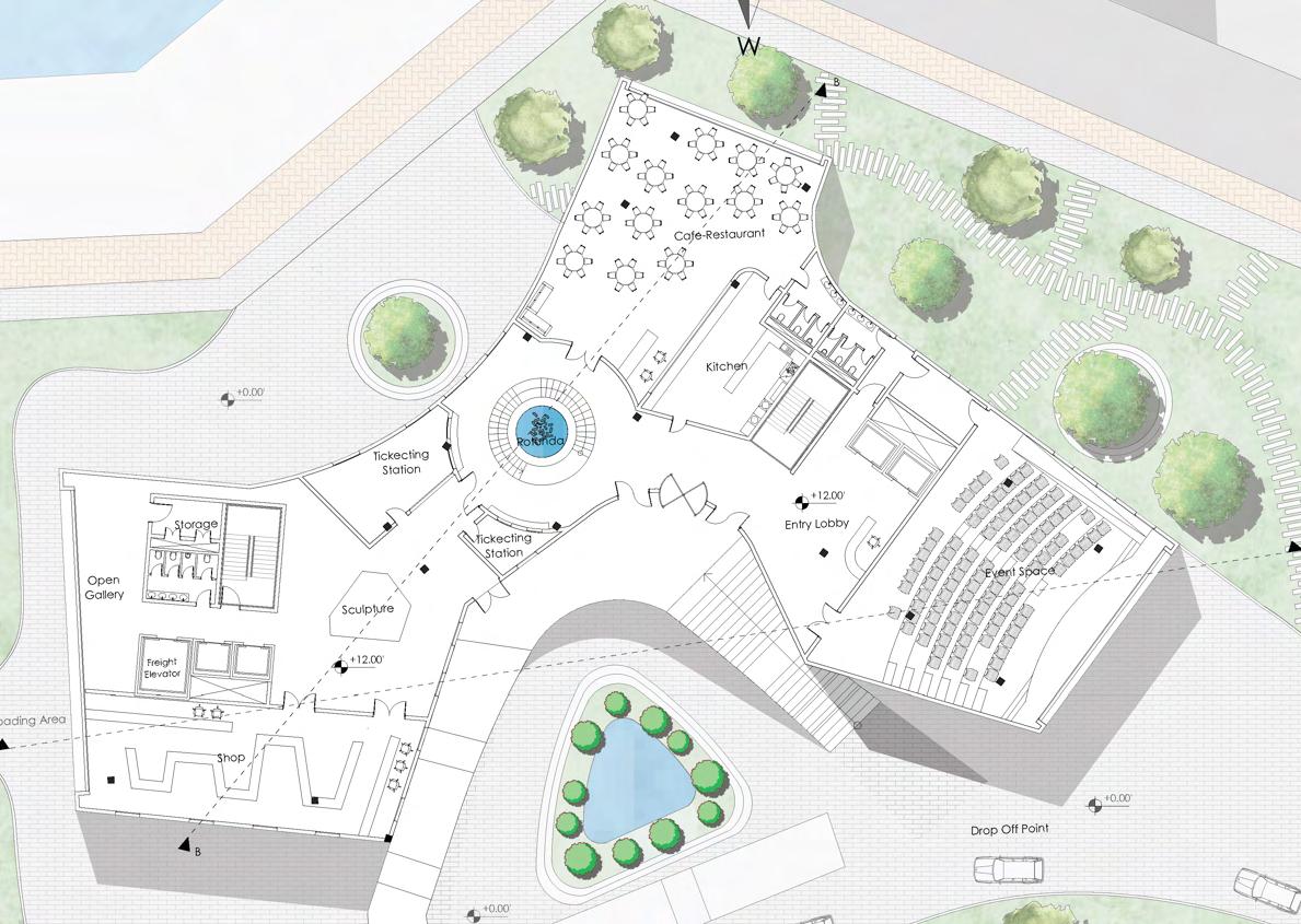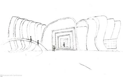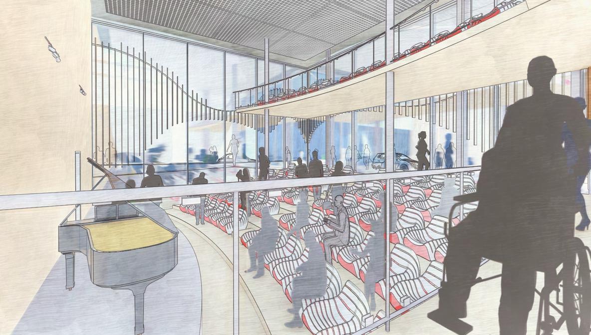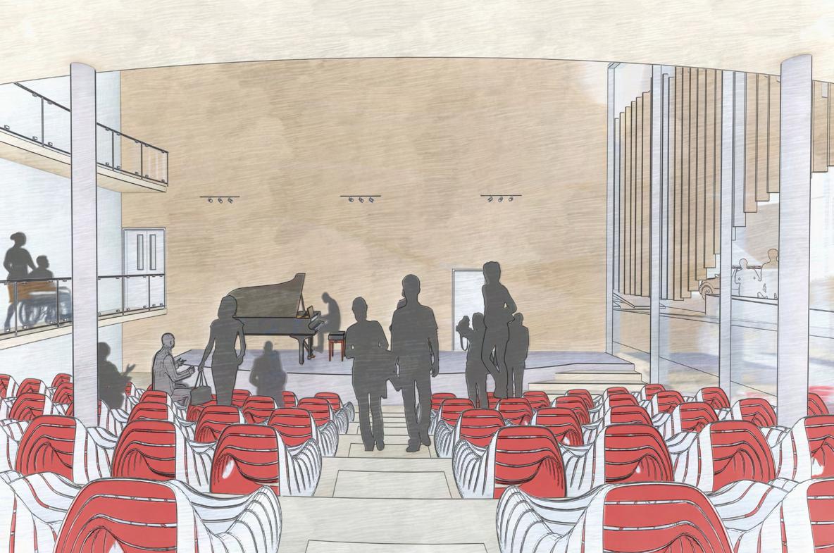 My interpretation of the selected musical specimen focused on themes of uncertainty and despair. However, rather than recreating that experience for visitors, I chose to subvert it transforming uncertainty into excitement and joy. The resulting design features three distinct performance spaces: an underground indoor theater, a ground-level outdoor space, and a rooftop performance area.