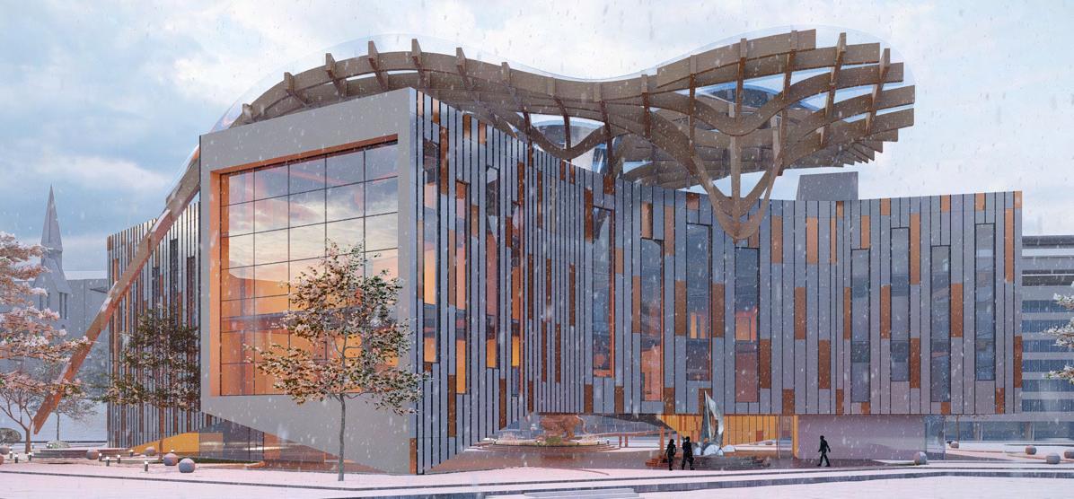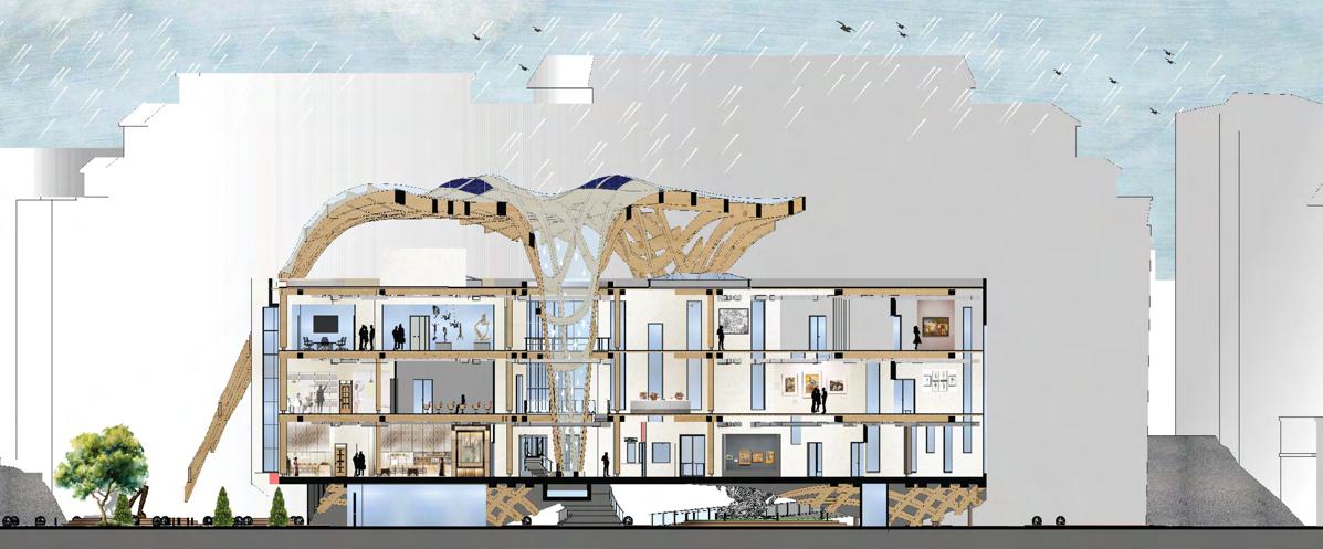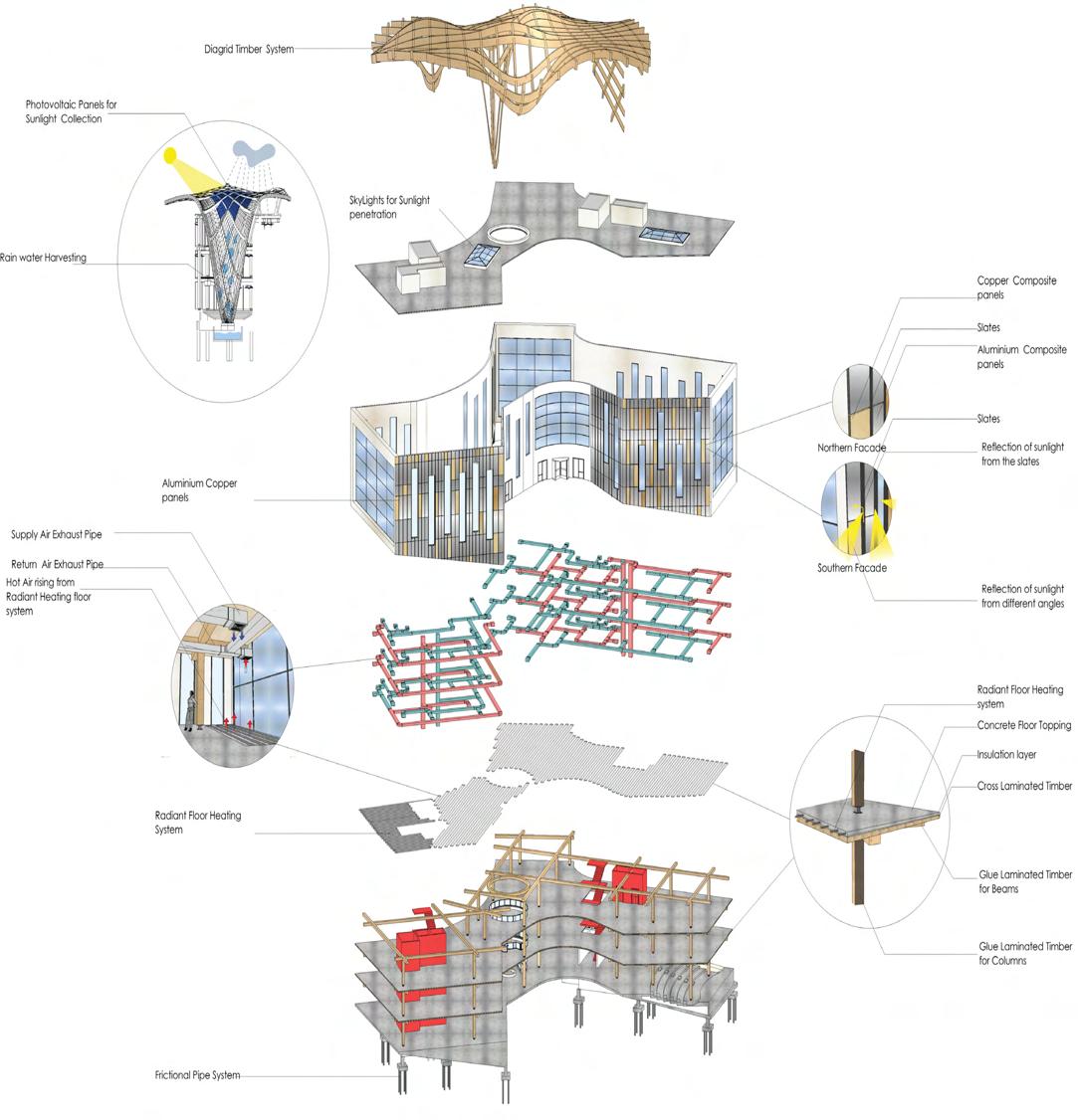 The project involves the unique design and construction of a three-story Museum of Architecture and Design, standing 47 feet tall. The museum will feature exhibition spaces, a restaurant offering traditional Helsinki cuisine, an event area, and workshops. Key sustainability features include solar energy harvesting systems integrated into the Diagrid and facade to reduce energy consumption and rainwater collection systems to support non-potable water use, such as landscape irrigation.