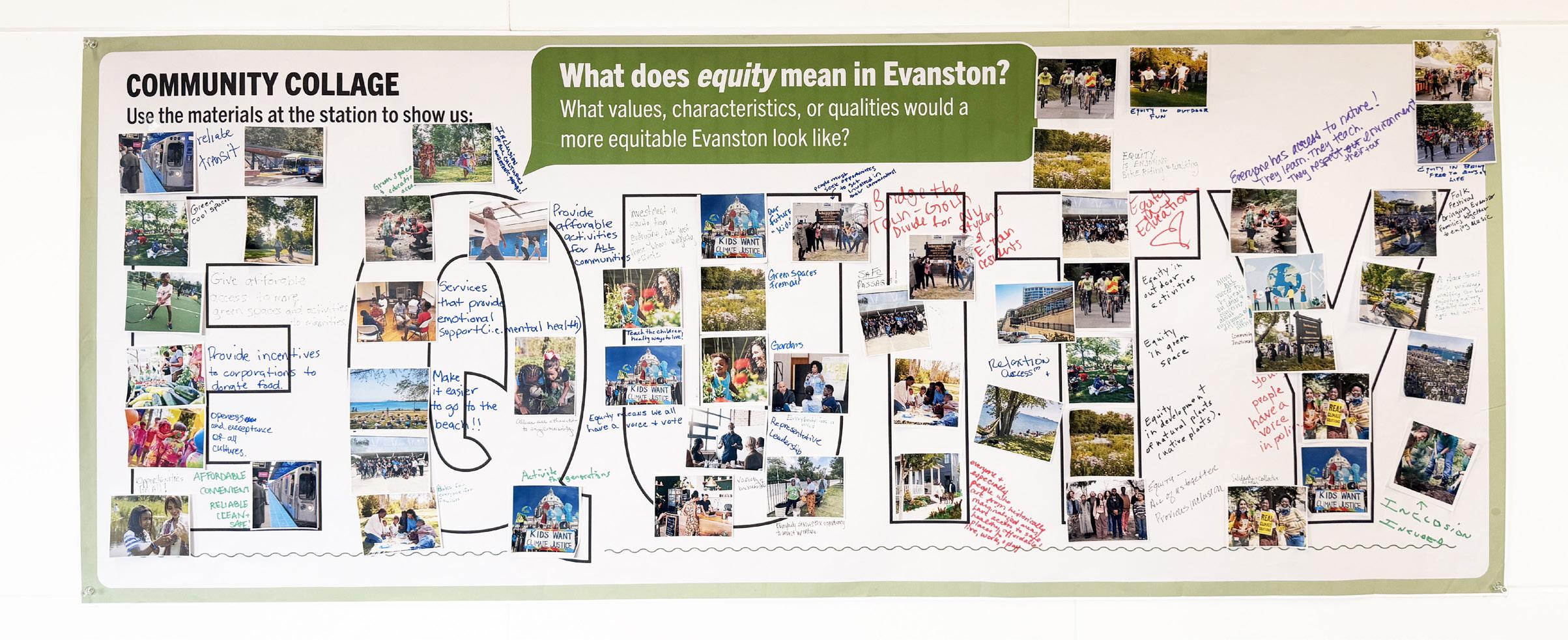 Over the course of several public workshops, community members created a collage communicating what equity means to them; illustrating the values, characteristics, and/or qualities that would be representative of a more equitable Evanston.