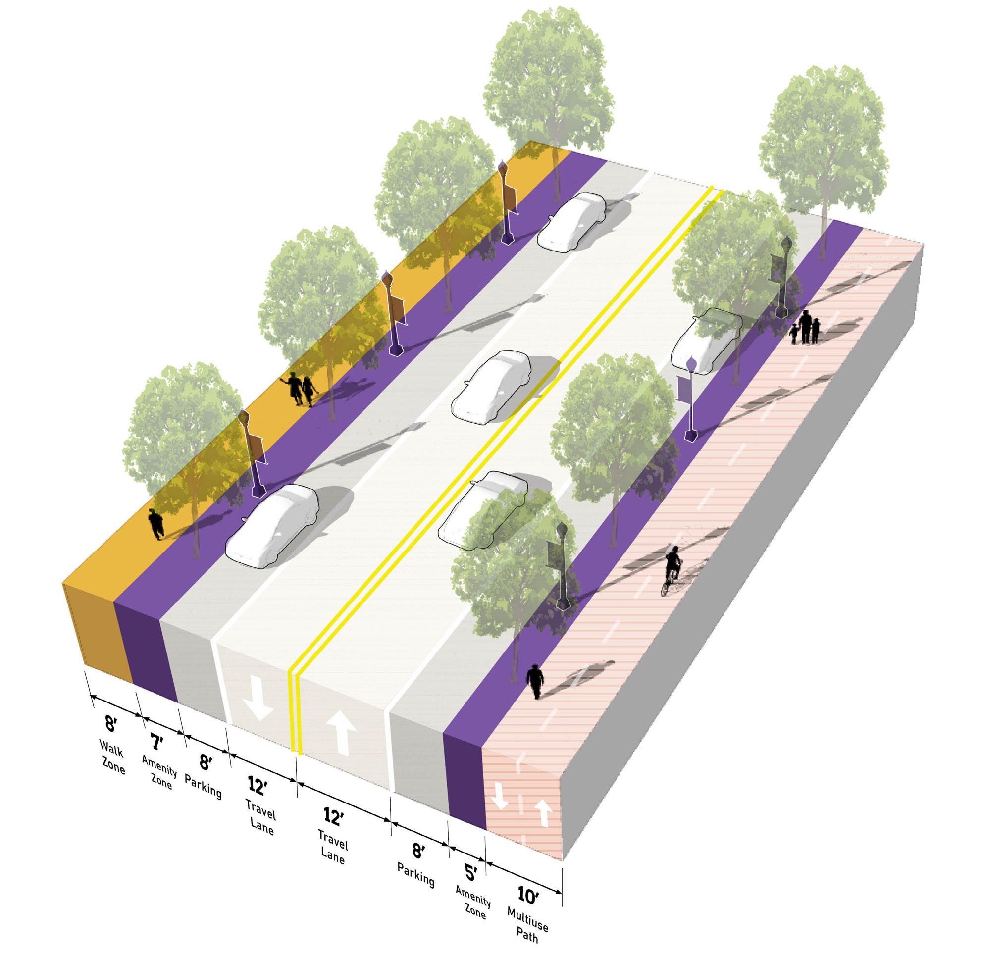 • Design and build pedestrian facilities along Main Street connecting the station to Columbia Avenue, planned trails, future development sites, and the planned Calumet Avenue/Ridge Road improvements. Connectivity should include 10’ multi-use paths on one side of the road and sidewalks on the other side. Pedestrian signals and crosswalks should be added to signalized intersections.
