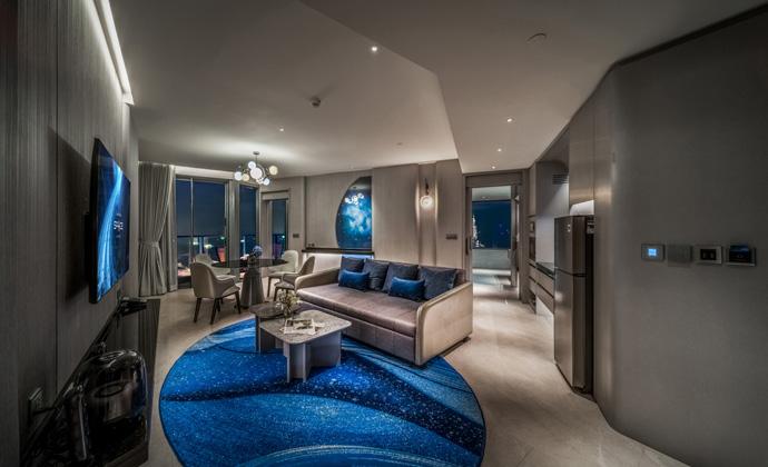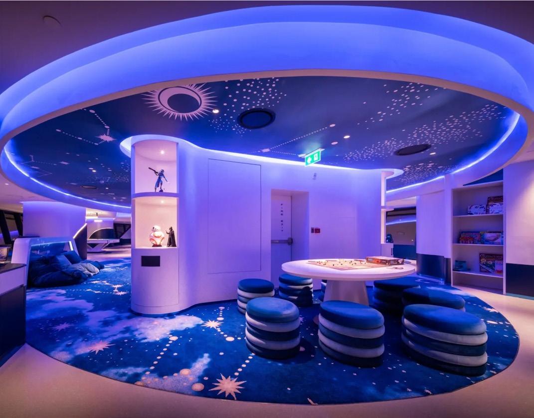 Inside the guest rooms, the journey into the cosmos continues. Each room is meticulously designed to resemble accommodations aboard a spacecraft, and at night, a captivating light show unfolds, replicating the dazzling colours of space. Glittering constellations dance across the decorative ceilings, complemented by the soft glow of aurora-like lamplight. Underfoot, the deep blue galaxy-like motifs of Royal Thai carpets further create an ambience akin to floating in outer space, cocooning guests in total comfort and awe.