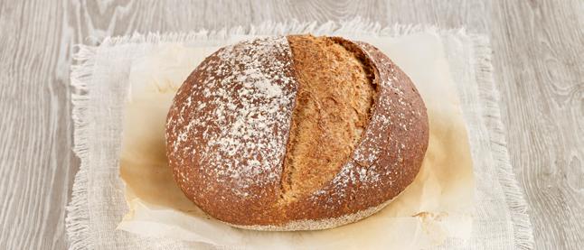 DESCRITPION: French-style, stone-ground and whole-grain bread with a touch of rye, made using Masa Madre. The stone-ground, whole-grain flour used to make the Masa Madre gives the bread a slightly acidic taste. This enhances its flavour, which is reminiscent of the grain and toasted dried fruit. The wheat germ in the stone-ground, whole-grain flour makes this bread rich in minerals and oligoelements.