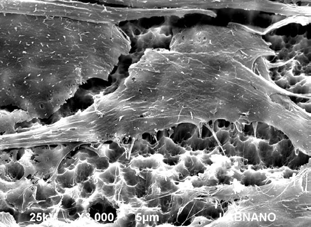 Microscopía electrónica de barrido que demuestra la presencia de células osteoblásticas en la superficie del HAnano®. Cortesía: Cavalcanti, JH. Tanaka, M. Bezerra, FJ. CBPF RJ.