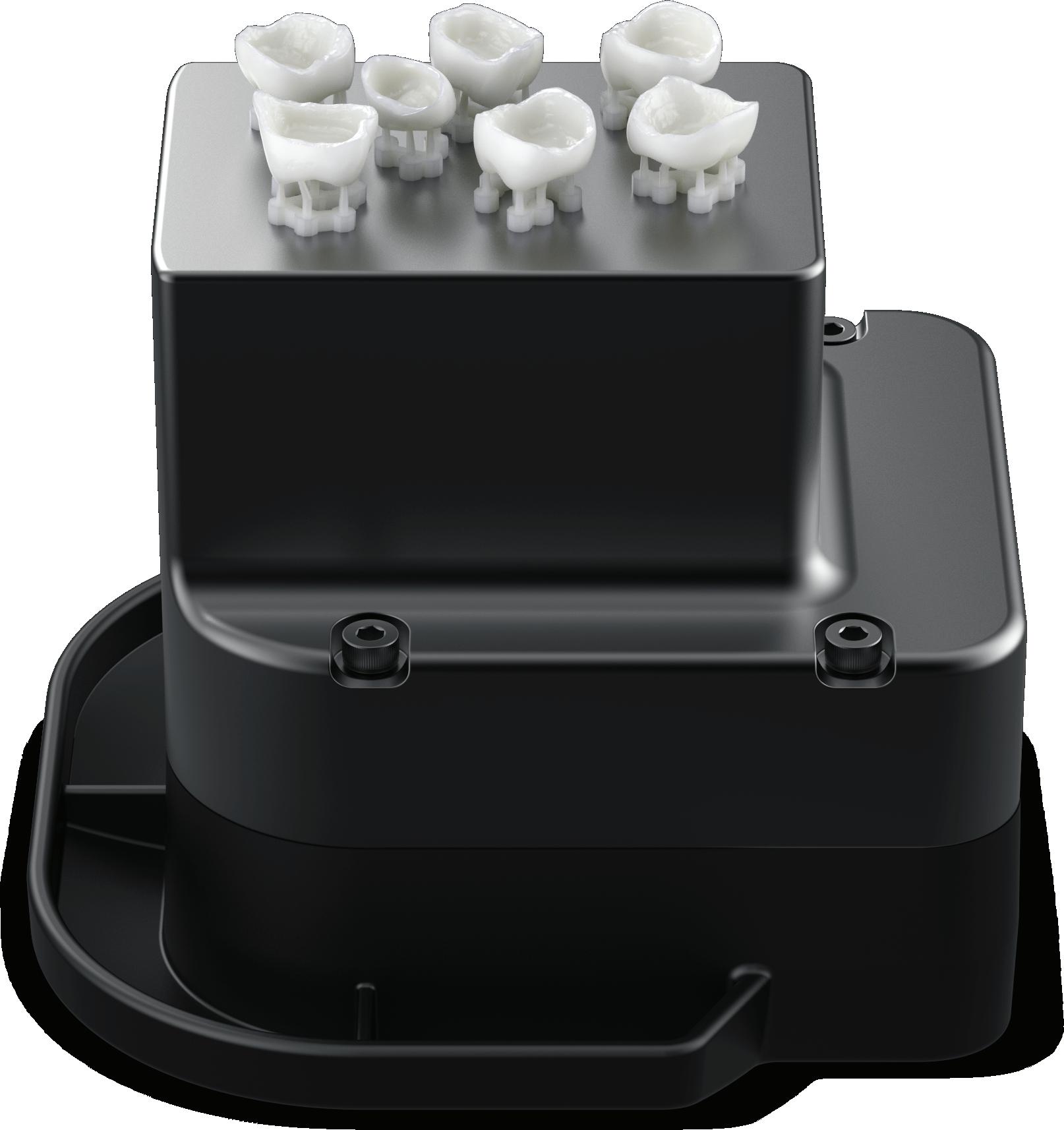 O Crown Kit Pro S consiste em uma nova plataforma de construção compacta e um tanque de resina projetados para a produção rápida de até 6 coroas unitárias em apenas 10 minutos.