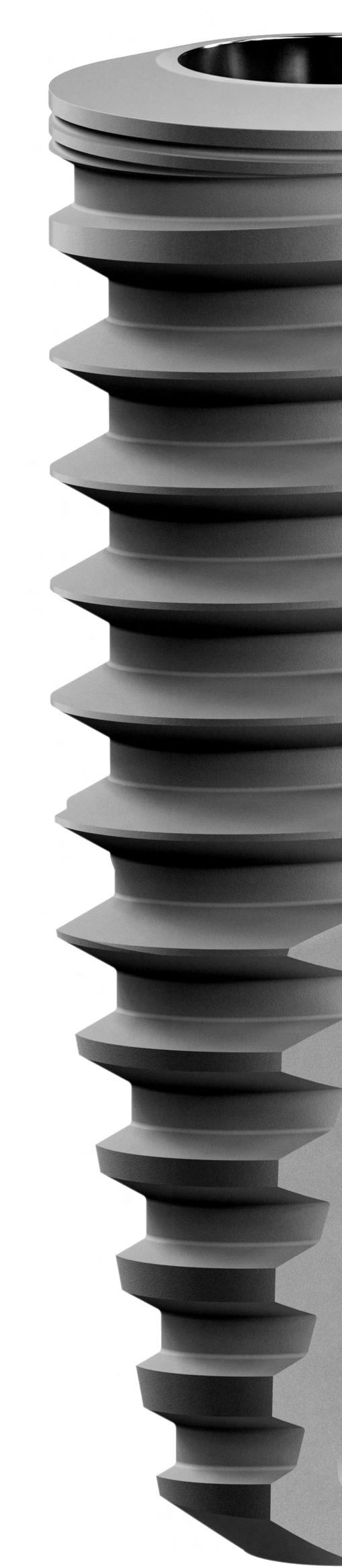 Profundidade e geometria das roscas oferecem alta estabilidade primária e maior velocidade de inserção. que facilitam a instalação do implante.