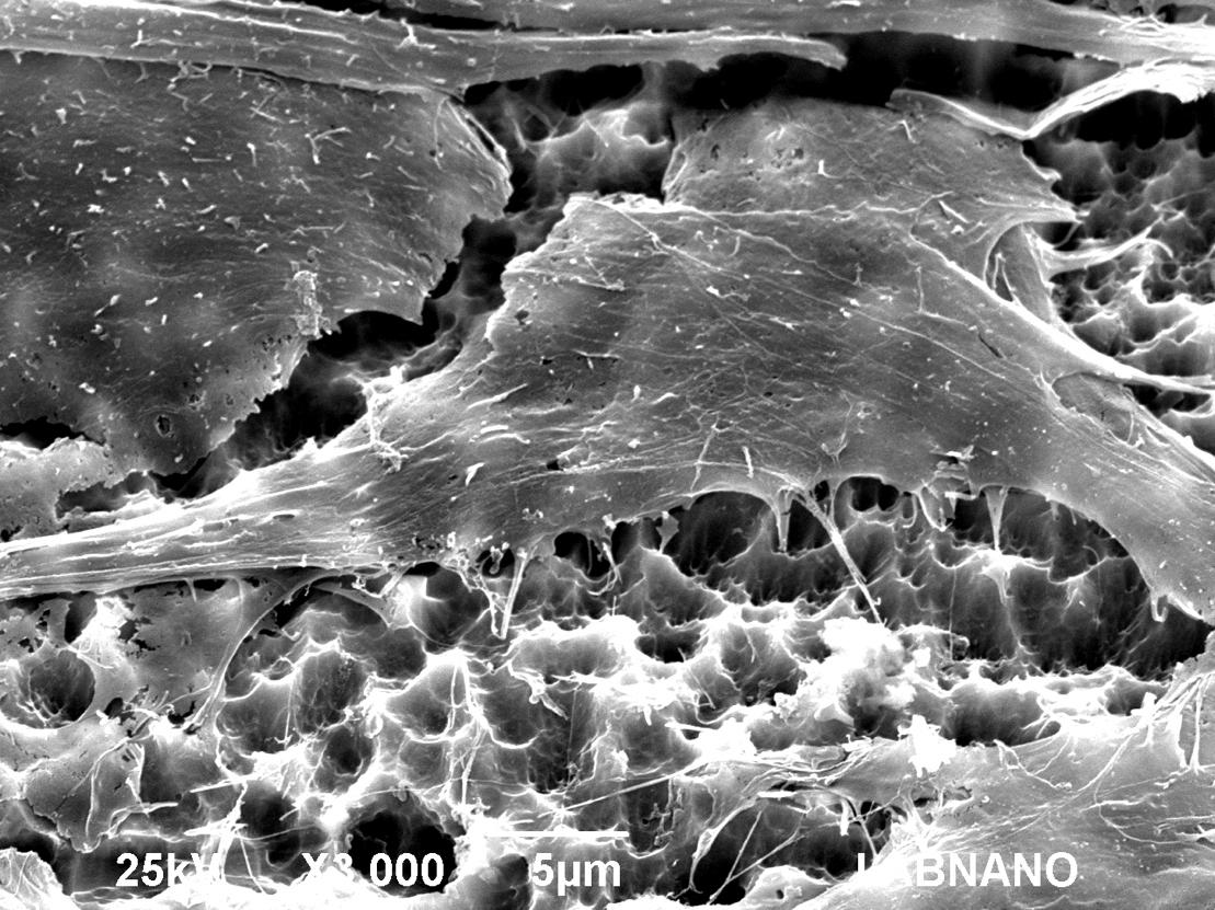 Scanning Electron Microscopy demonstrating osteoblastic cell on HAnano surface. Courtesy: Cavalcanti JH, Tanaka M, Bezerra FJ, CBPF RJ.