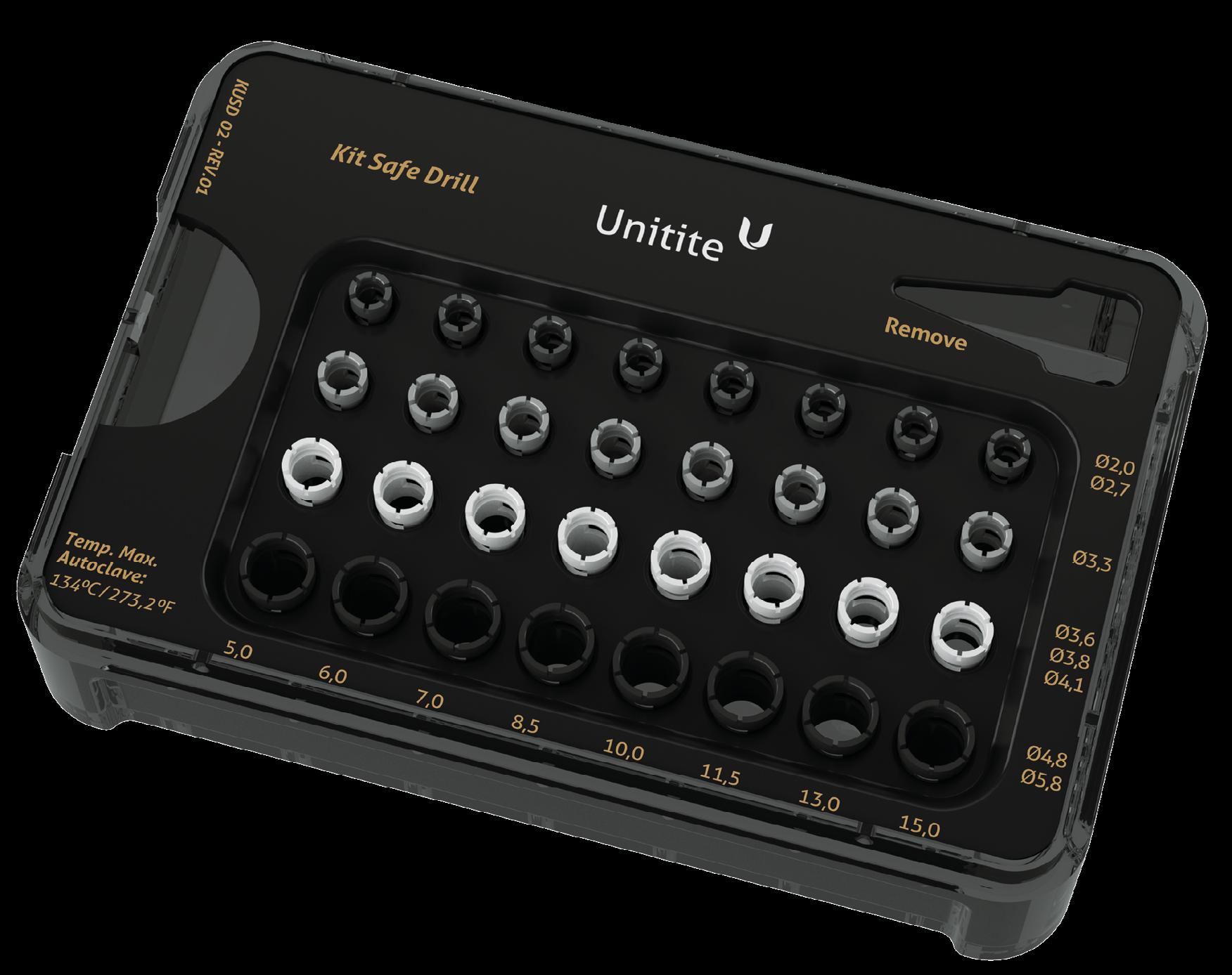 All Unitite® drills are designed for use with the limiters in the Safe Drill kit. Less surgery time benefits professionals and patients. PRODUCT CODE: KUSD 02 ORGANIZING BOX CODE: COUSD 02