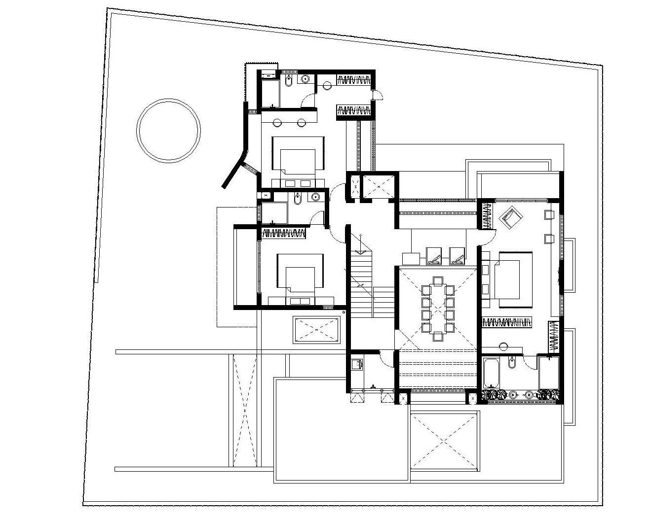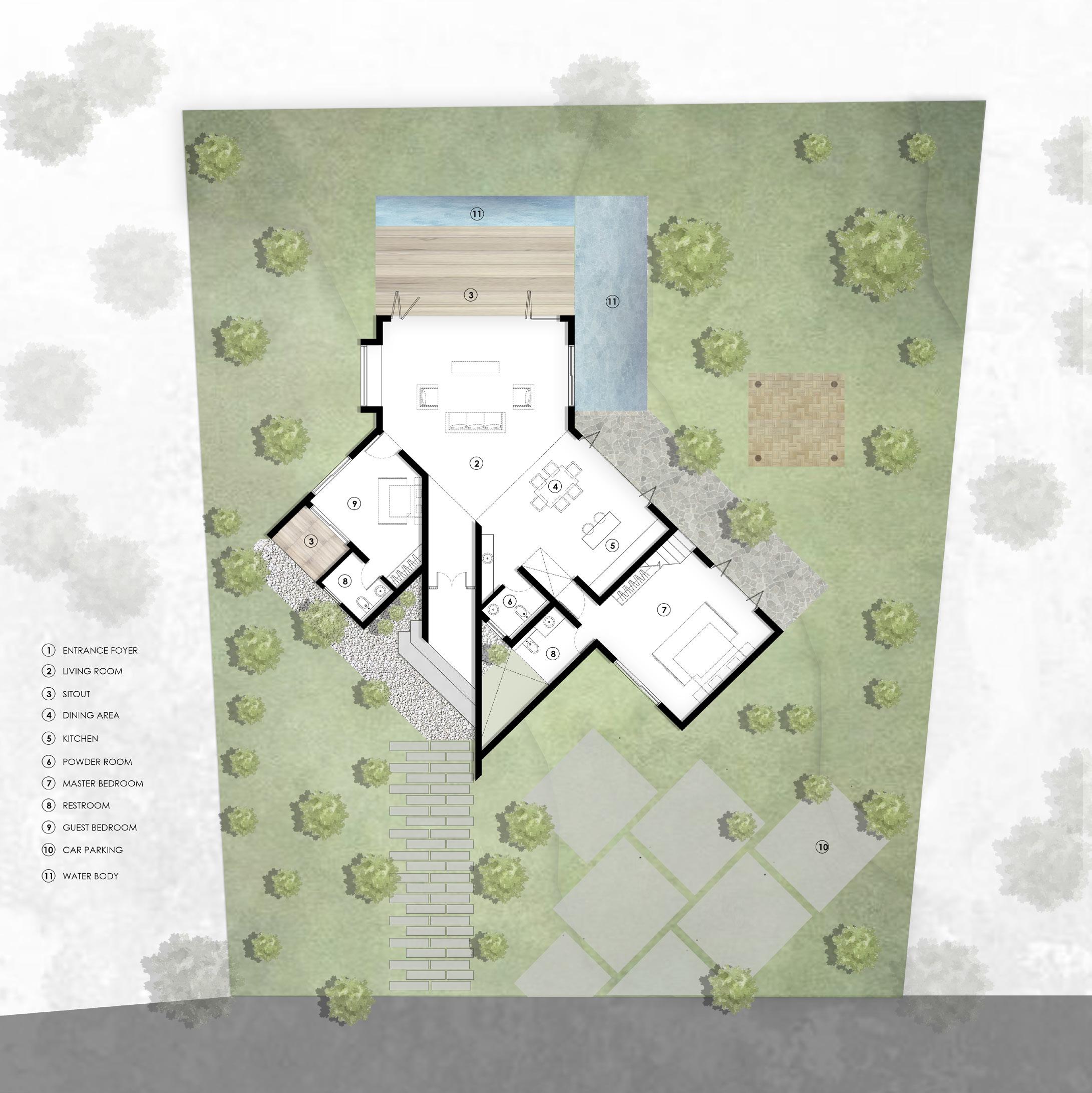 As the major requirement, a 2bhk villa with an open living and dining area with an island kitchen and also an outdoor sit-out and dining. In addition to that a swimming pool and open-to-sky toilet for the master bedroom.