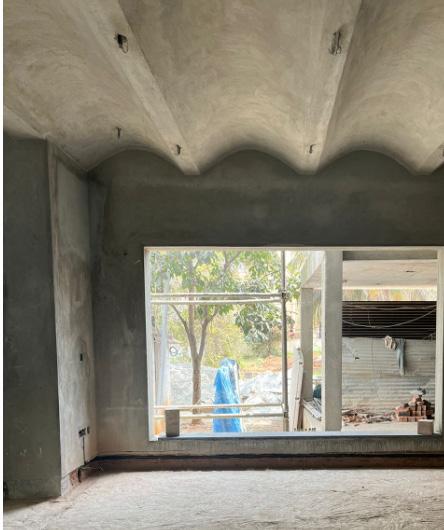 The living area has a massive opening on the east side with a beautiful view of the paddy field followed by mountains in the backdrop. Dining along with the island kitchen and Master bedroom has a view of the existing beauty of the landscape on the site, where the outdoor dining sit-out enjoys the same. The difference in the roof level and arched roof for the guest bedroom creates an interesting massing for the house.