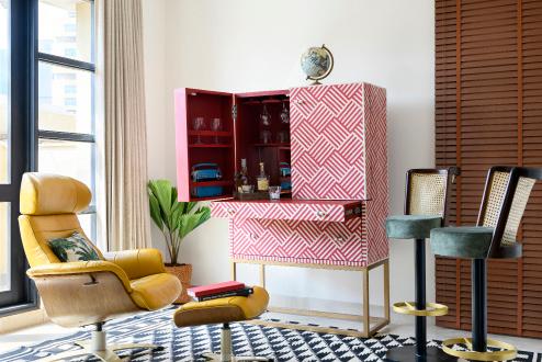 The bar area is an instant crowd-puller with a bar cabinet done in bone inlay finish and a pull out countertop. The patterns of this piece, the colours of the surrounding seating and the geometric carpet add a distinct character.
