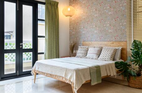 The guest bedroom attracts with its maturity brought about by a printed, neutral shade wallpaper and wooden blinds. A cane pendant light and green drapes contribute to its snuggly vibes. The primary bedroom has a serene but fun feel. Lemon yellow embroidered curtains with a botanical mural on the wall showcase the playful personalities of the users. A rubberwood sliding door leading to the walk-in wardrobe and the lush appeal of the custom-made bed stir opulence in the room.