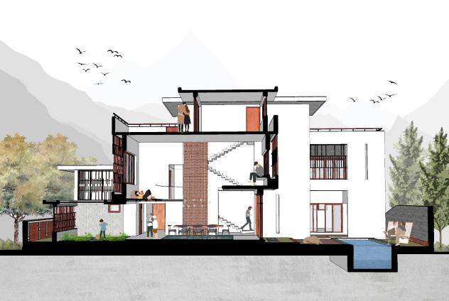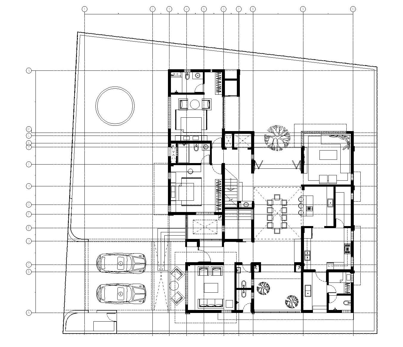 The clients are a family of five where the husband and wife are doctors with three small kids. The major requirement is a 5bhk villa with two kitchens and the villa having swimming pool views. Retaining the existing trees and the wells are also considered in the design.