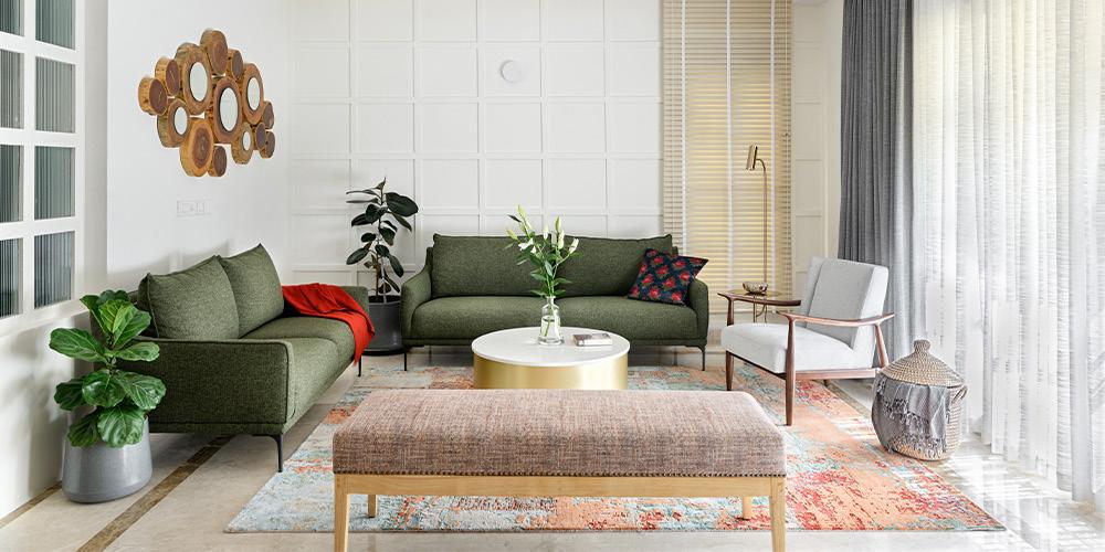 The living room boasts an army green sofa set and a white chair, alluding to an informal and stylish setting. Elements such as square wall panelling, artwork made of wood and a combination of sheer and luxe drapery imbue elegance. Potted plants, a gold-finished centre table and ceiling light and a colourful carpet weave the narrative together.
