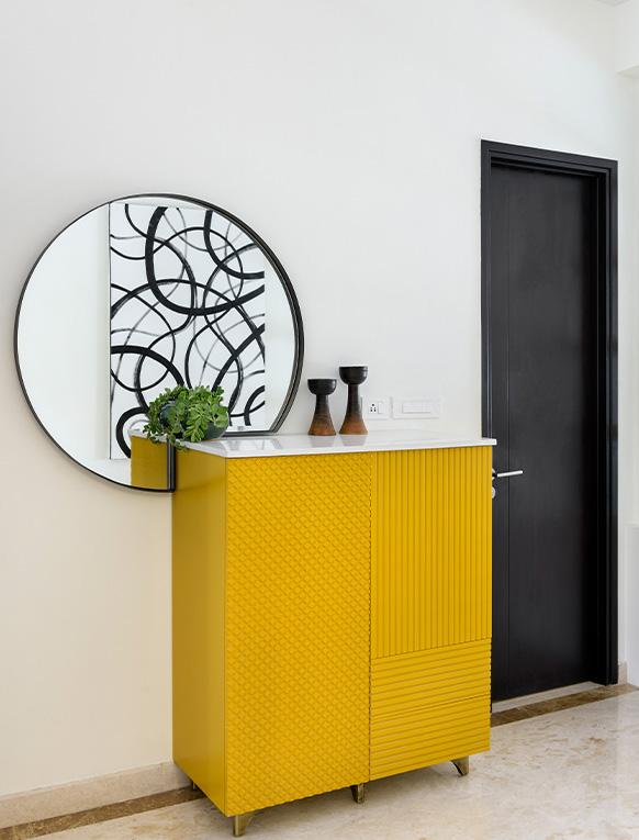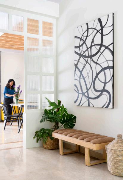 On entering, a foyer defined by a white ducco-painted partition with an embedded reed glass inlay starts setting the home’s character. On one side is a custom-made, bright yellow cabinet with a mirror cut to fit its corner. This mirror reflects the painting on the other side of the foyer. Below the painting, a quaint bench balances the drama in the space.