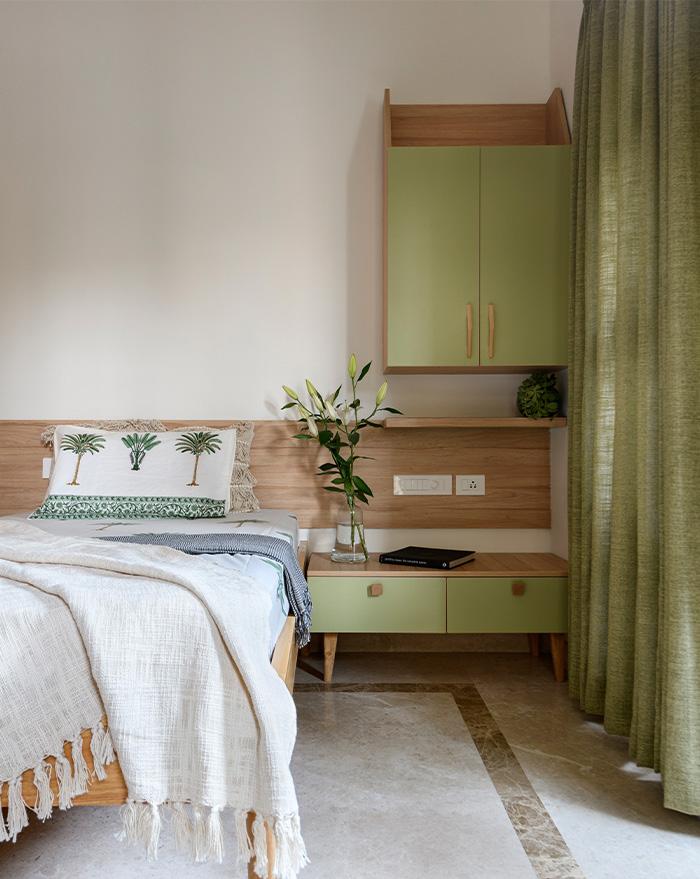 What is most notable about the home is not just the emphasis on ‘green’ in the colour scheme but also its approach. Solar power meets all the energy requirements of the house, and a food crusher is employed for better waste management. The crushed waste is converted to manure and used in the back garden.