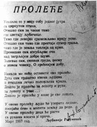 од прве штампане песме „Пролеће“ (1957), у којој пева Уселило се у моју собу једног јутра / са цвркутом птица, и прве збирке Тандара –