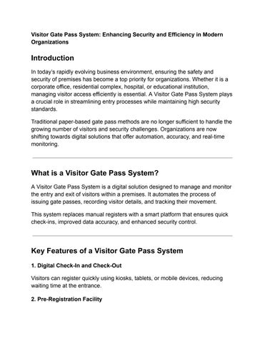 With increasing security concerns and the need for automation, digital visitor management solutions are becoming essential A modern Visitor Gate Pass System not only strengthens security but also improves the overall visitor experience.