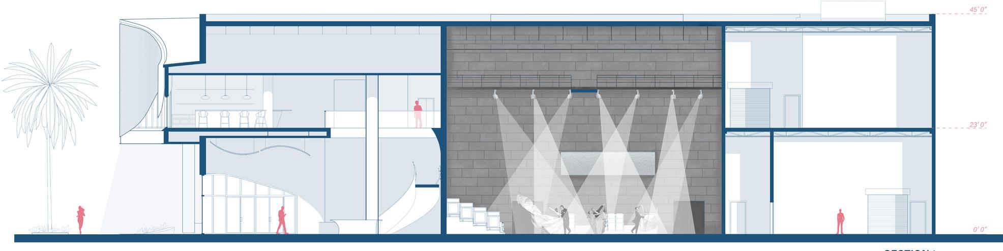 THIS PROJECT IS AN INFILL DEVELOPMENT LOCATED IN DOWNTOWN GULFPORT, MS, DESIGNED TO SERVE AS A CULTURAL ICON AND A HUB FOR THE ARTS. THE VISION WAS TO CREATE A WELCOMING SPACE THAT DRAWS THE PUBLIC IN FROM THE STREET EDGE, FOSTERING A CONNECTION BETWEEN THE ARTS AND THE LOCAL COMMUNITY. THE BUILDING’S DESIGN AMPLIFIES THIS NARRATIVE BY PHYSICALLY OPENING THE FIRST-FLOOR ENVELOPE TO CREATE A VIBRANT NODE FOR PUBLIC ENGAGEMENT, WHICH CAN ALSO SERVE AS AN OUTDOOR PERFORMANCE VENUE. THE SECOND FLOOR FEATURES A CURTAIN WALL AND PERFORATED RAIN SCREEN, OFFERING PASSERSBY GLIMPSES INTO PERFORMANCE AND PRACTICE SPACES, SPARKING CURIOSITY AND INTEREST. THIS PROJECT ASPIRES TO BECOME A CENTERPIECE OF CULTURAL EXPRESSION, ENRICHING THE ARTISTIC FABRIC OF DOWNTOWN GULFPORT, MS.
