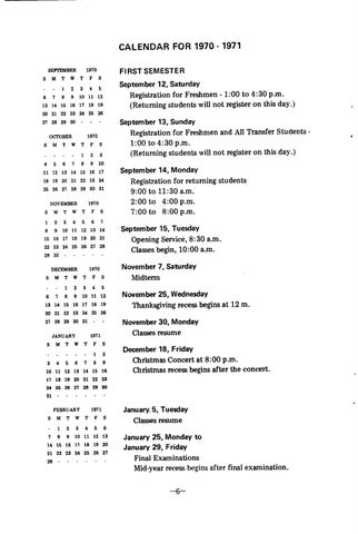 September 14, Monday Registration for returning students 9:00 to 11:30 a.m. 2:00 to 4:00 p.m. 7:00 to 8:00 p.m. September 15, Tuesday Opening Service, 8:30 a.m. Classes begin, 10:00 a.m. November 7, Saturday Midterm November 25, Wednesday Thanksgiving recess begins at 12 m.