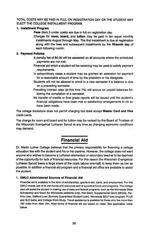 Financial Aid Dr. Martin Luther College believes that the primary responsibility for financing a college education lies with the student and his or her parents. However, the college does not want anyone who wishes to become a Lutheran elementary or secondary teacher to be deprived of the opportunity for lack of financial resources. For this reason the Wisconsin Evangelical Lutheran Synod bears a large share of the costs (about one-half) to keep them as low as possible. In addition a financial aid program and a financial aid office are available to assist the student. 1. DMLC Administered Sources of Financial Aid Financial aid Is available In the form of scholarships, grants-in-aid, loans, and employment. For this DMLC makes use of Its own funds and resources and of synodical funds and programs. The college also will assist the student In making use of state and federal programs, such as the Minnesota State Scholarship and Grant (for Minnesota residents only), Pell Grant, Supplemental Grant (SEOG), Perkins Loan, Stafford Loan (formerly Guaranteed Student Loan), Minnesota SELF loan program, PLUS and SLS loans, and College Work-Study. Travel assistance Is available for those who live more than 750 miles from New Ulm. Most forms of financial aid are based on need. See application notes below.