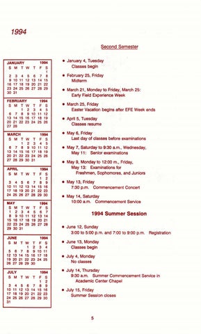 • June 13, Monday Classes begin • July 4, Monday No classes • July 14, Thursday 9:30 a.m. Summer Commencement Service in Academic Center Chapel • July 15, Friday Summer Session closes