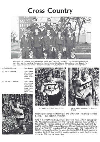 I really appreciated the team spirit and unity which I never experienced before. - Sue Tessmer, Freshman Who in their right mind would run 3 or even 8 miles without being paid? The 15 people in cross country this year did it because they wanted to. Cross Country takes a special commitment displayed by everyone during the exciting 1988 season. No one will forget the infamous monstrosity known as "the Hill". found on DMLC's own course. 1988 marked the 1st NLCAA National Cross Country Meet. hosted by DMLC. Though everyone crossed the finish line. and the season has long ended. the friendships made in 1988 are just beginning.