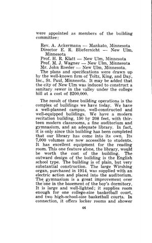 Rev. A. Ackermann - Mankato, Minnesota Director E. R. Bliefernicht New VIm, Minnesota Prof. H. R. Klatt - New Ulm, Minnesota Prof. M. J. Wagner - New VIm, Minnesota Mr. John Roeder - New VIm, Minnesota. The plans and specifications were drawn up by the well-known firm of Toltz, King, and Day, Inc., St. Paul, Minnesota. It may be added that the city of New Ulm was induced to construct a sanitary sewer in the valley under the college hill at a cost of $200,000. The result of these building operations is the complex of buildings we have today. We have a well-planned campus, well-constructed and well-equipped buildings. We have a modern recitation building, 150 by 208 feet, with thirteen modern classrooms, a fine auditorium and gymnasium, and an adequate library. In fact, it is only since this building has been completed that our library has come into its own. Its 7,000 volumes are now accessible to students. It has excellent equipment for the reading room. This one feature alone, the library, would be worth the cost of the building. The outward design of the building is the English school type. The building is of plain, but very substantial construction. The large Wirshing organ, purchased in 1914, was supplied with an electric action and placed into the auditorium. The gymnasium is a great improvement over the 'one in the basement of the boy's dormitory. It is large and well-lighted; it supplies room enough for one college-size basketball court, and two high-school-size basketball courts. In connection, it offers locker rooms and shower 66