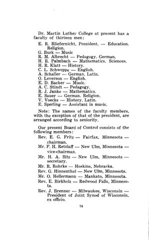 Religion. G. Burk - Music R. M. Albrecht - Pedagogy. German. H. R. Palmbach - Mathematics. Sciences. H. R. Klatt - History. C. L. Schweppe - English. A. Schaller - German. Latin. O. Leverson - English. E. D. Backer - Music. A. C. Stindt - Pedagogy. R. J. Janke - Mathematics. E. Sauer - German. Religion. V. Voecks - History. Latin. E. Sperling - Assistant in music. Note: The names of the faculty members, with the exception of that of the president, are arranged according to seniority. Our present Board of Control consists of the following members: Rev. E. G. Fritz - Fairfax, Minnesotachairman. Mr. F. H. Retzlaff - New VIm, Minnesotavice-chairman. Mr. H. A. Sitz - New VIm, Minnesotasecretary. Mr. R. Rohrke - Hoskins, Nebraska. Rev. G. HinnenthaI- New VIm, Minnesota. Mr. O. Hellermann - Mankato, Minnesota. Rev. E. Birkholz - RedwoodFalls, Minnesota. Rev. J. Brenner - Milwaukee,Wisconsin President of Joint Synod of Wisconsin, ex officio. 74