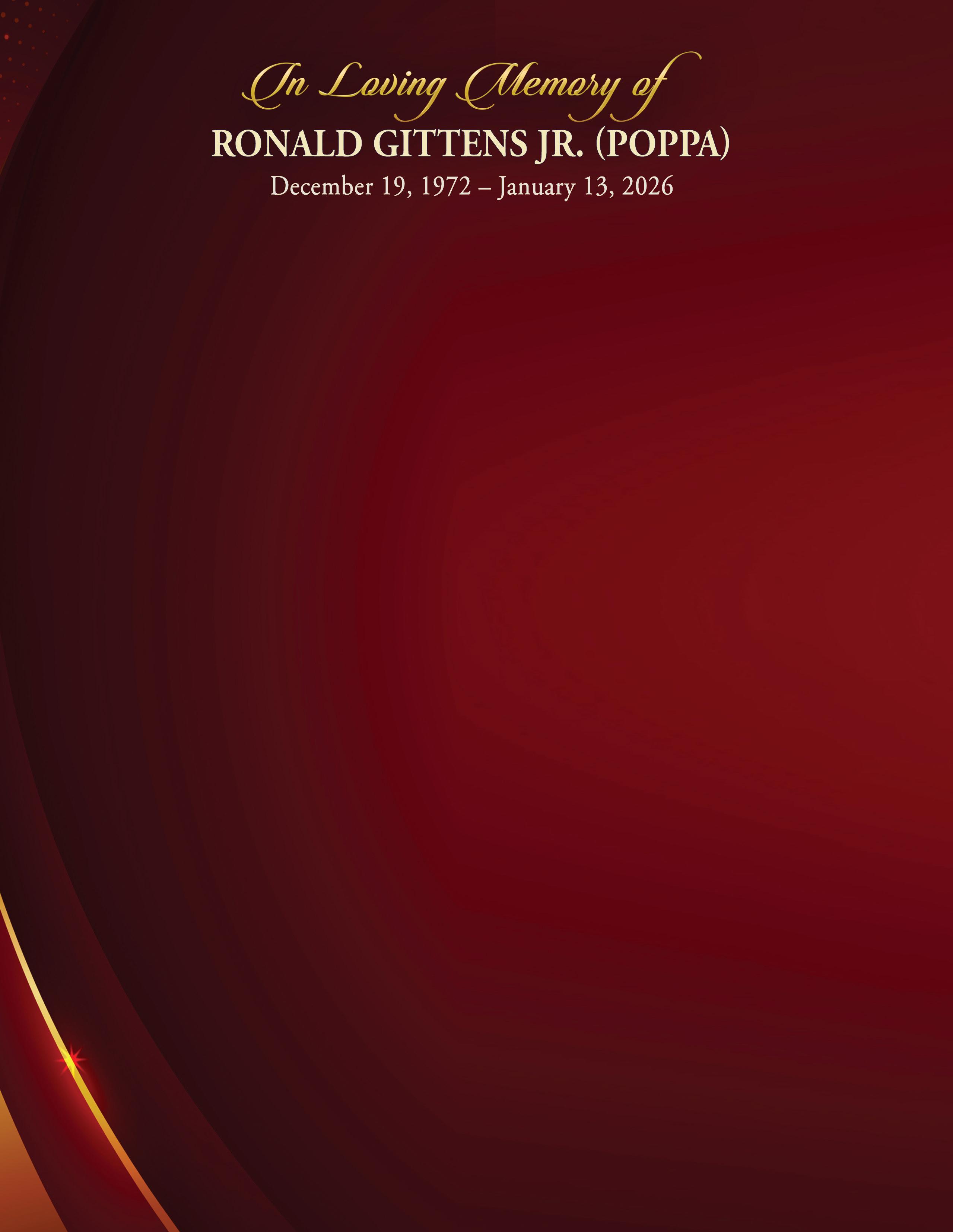 Ronald Gittens Jr., affectionately known as Poppa, was born on December 19, 1972, in New York City to the late Ronald Gittens Sr. and Betty Jean-Hodges Gittens. He departed this life on January 13, 2026. Ronald was raised with strong family values, faith, and love. As a child and teenager, Ronald attended LaGree Baptist Church in Harlem, New York, where his spiritual foundation was nurtured. He was educated in the New York City public school system and attended Martin Luther King High School.