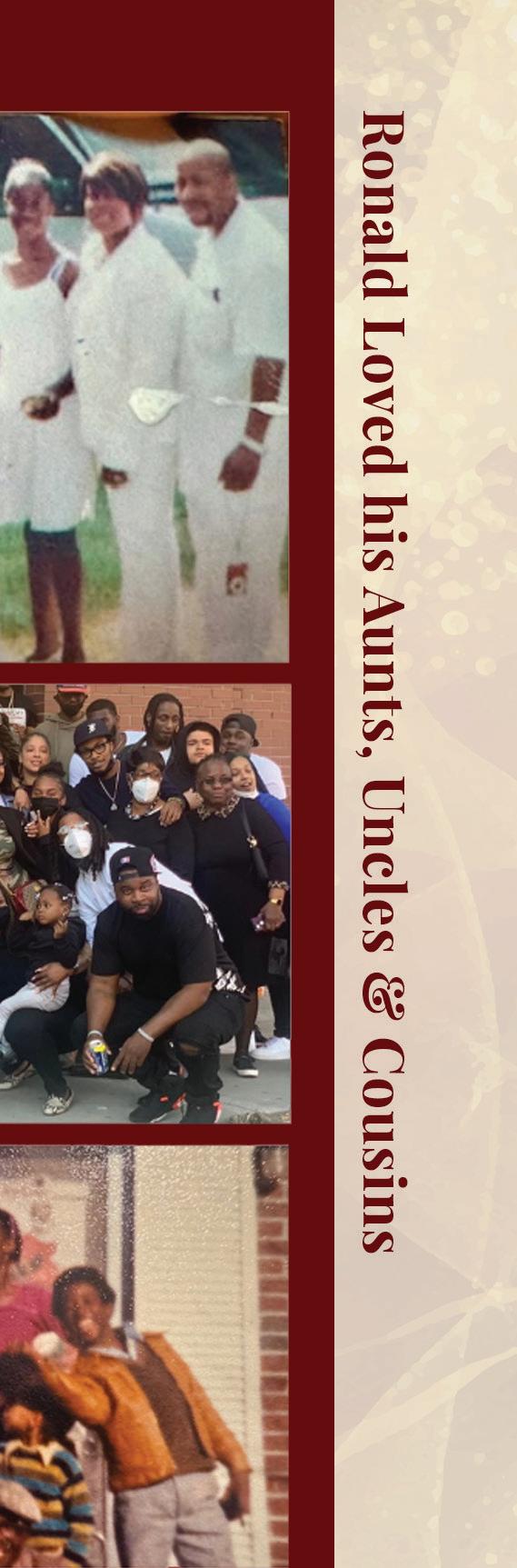 Ronald leaves behind a legacy of warmth, laughter, and love. He will forever be remembered and cherished by his loving partner Twanette; children, Tiani, Tyrie and Terrelle; grandchildren, Tia, Miles and Felix; stepmother, Andrea; godmother, Dorothy Williams; brothers, Samuel (Shanell), Laron, Ron G, Adrian, Archell, Avery, Aryan; sisters, Thomasina, Adasha, Alecia, Karen; god-sister, Kiera; godbrother, Mikey; nieces and nephews, Gregory, Ciara, Leilani, Sa’Niya, Christian, La’Ron,Jayceon, Carter and Cameryn; his uncles, Melvin, Calvin (Pam); his aunts, Phyllis, Brenda (Lonnie), Denise (Boobee), Francine (Tasha), Denise, his great-aunt Louise; his great-uncle Junior; favorite assistant, Alice and a host of close cousins, family, extended family, and friends that loved him dearly.