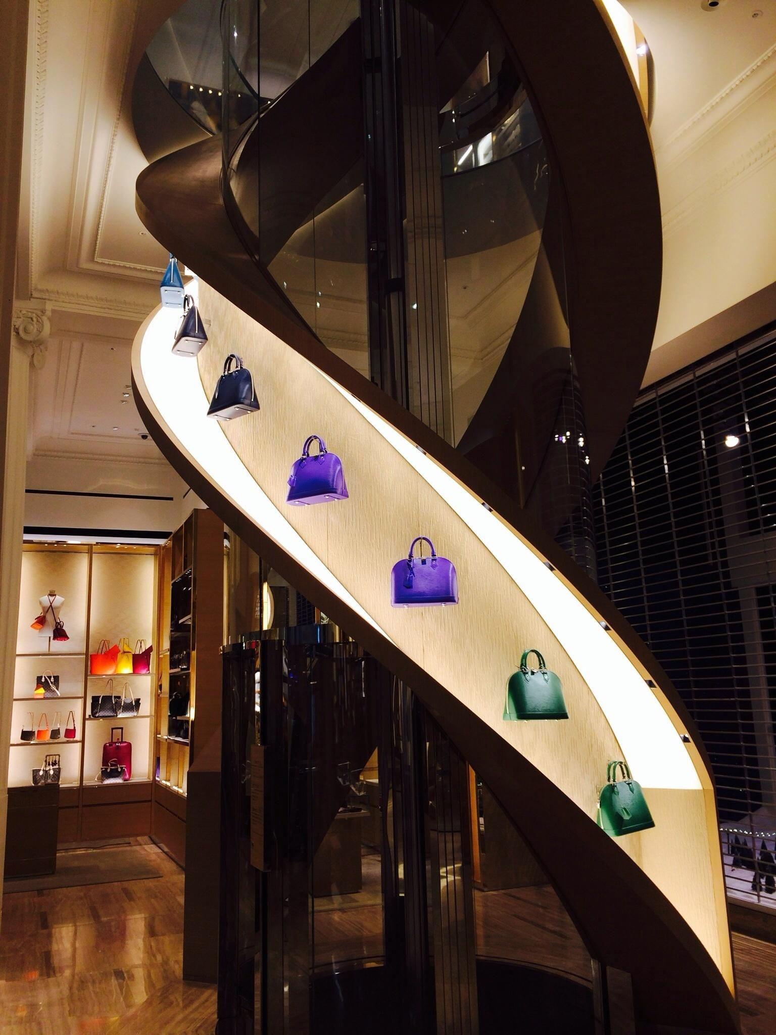 THE GLASS DOUBLE HELIX ELEVATOR ACTS AS THE FOCAL POINT IN THIS SPACE. IT IS THE HERO FEATURE THAT REVOLVES LIKE A CORKSCREW INSIDE A DOUBLE-HELIX-SHAPED STRUCTURE WITH A STREAM OF FLOATING HANDBAGS INSIDE IT. IT PIERCES THROUGH ALL THREE FLOORS OF THE BOUTIQUE, EMPHASIZING THE HISTORICAL BUILDING OF SELFRIDGES, CREATING A CONSTANT DIALOGUE BETWEEN MODERNITY AND TRADITION.