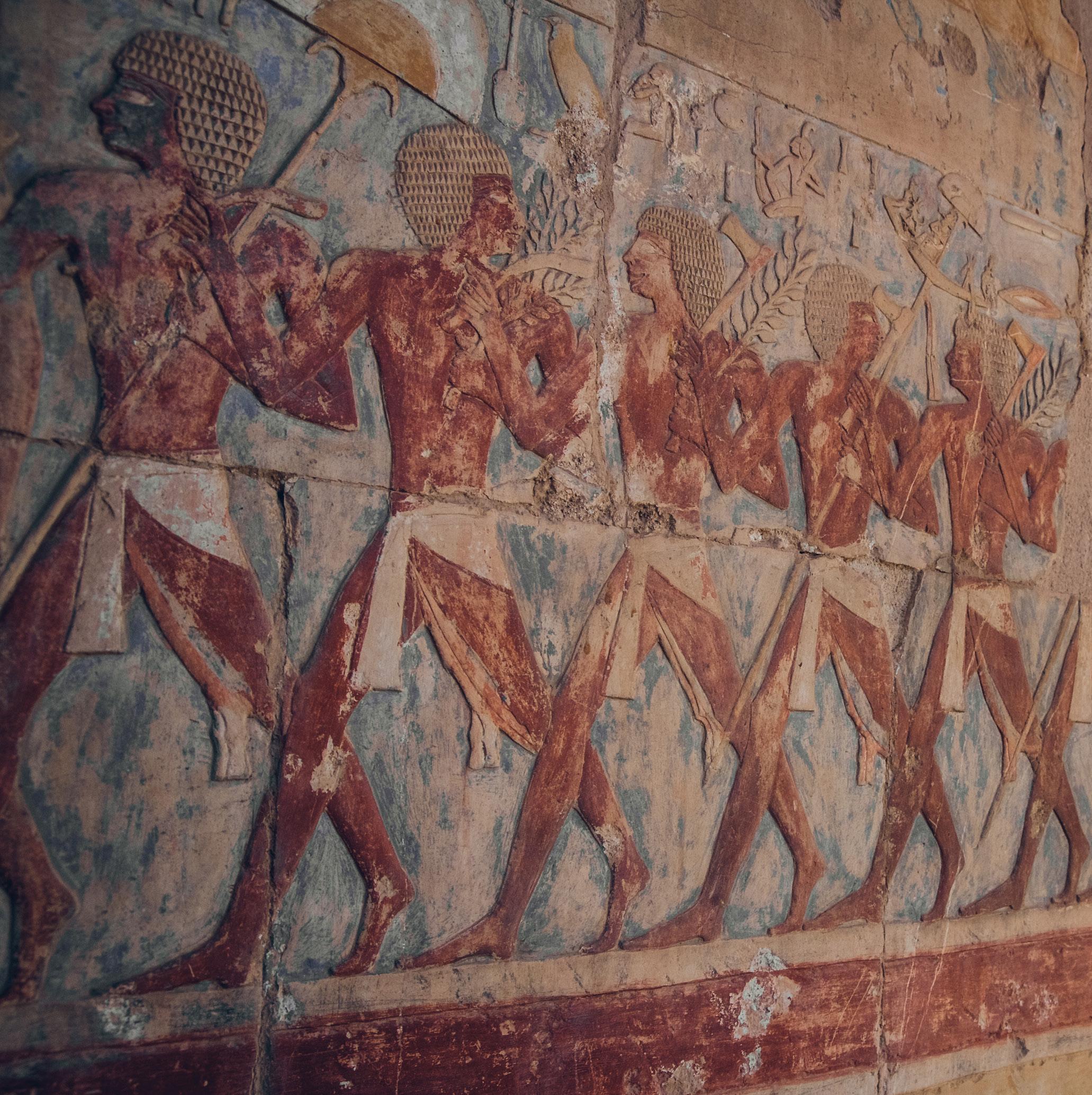 ANCIENT EGYPTIAN SCULPTURES SHOW THE SKIN OF MEN IN DEEP RED COLOR. THIS ILLUSTRATES HOW EGYPTIAN MEN UPHELD THE BELIEFS OF BRAVERY/FEARLESSNESS.