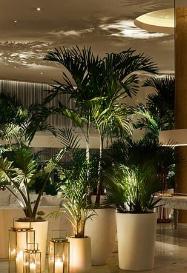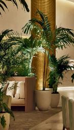 CURVED LINES ARE SEEN THROUGHOUT THE SPACE. ON CELINGS, WALLS AND FURNITURE. THEY DEPICT THE NATURAL FLOW OF THE PALM TREES. THEY ALSO MAKE THE SPACE WELL BALANCED AND VISUALLY PLEASING.