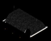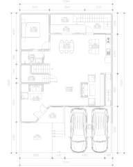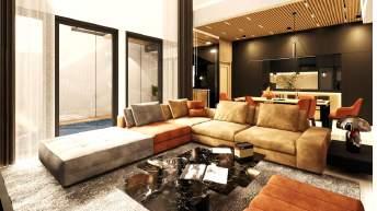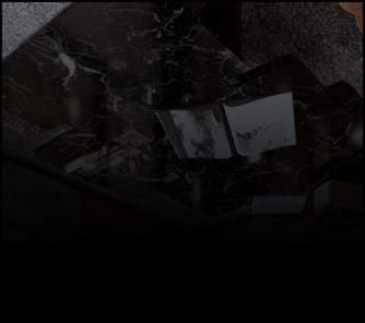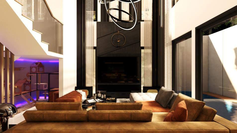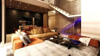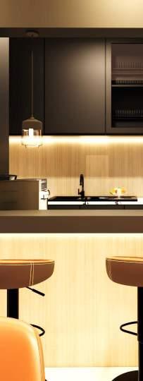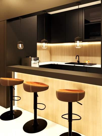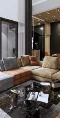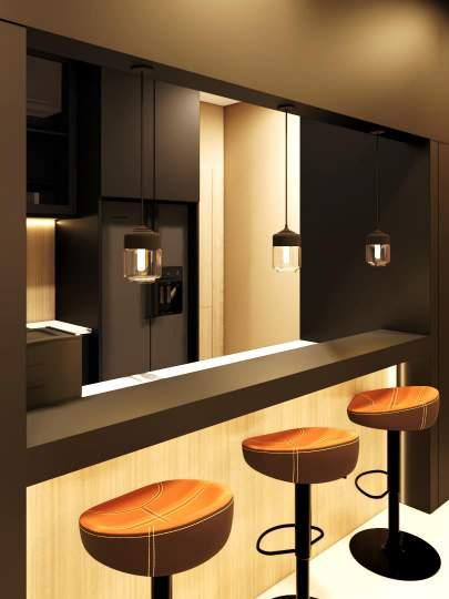 (kemungkinan granit atau marmer) untuk area makan, sementara ruang keluarga menggunakan karpet abu untuk kenyamanan. Didominasi oleh warna hitam matte dan panel