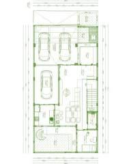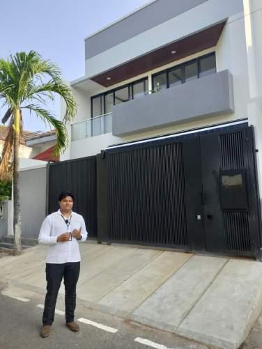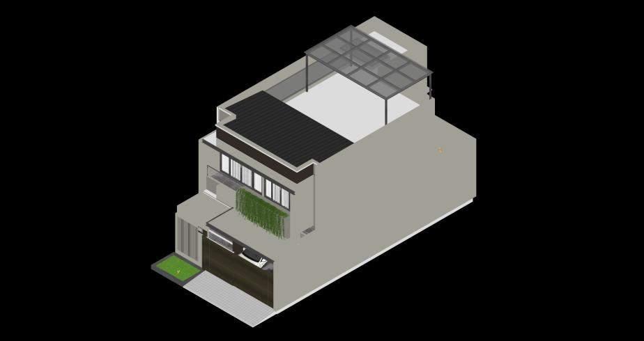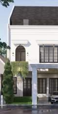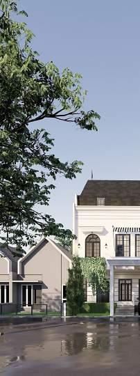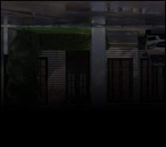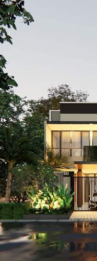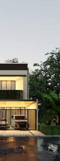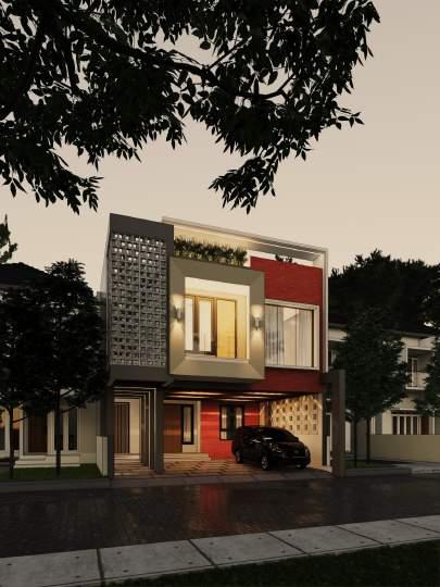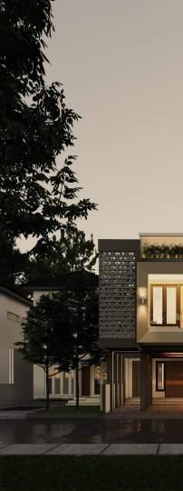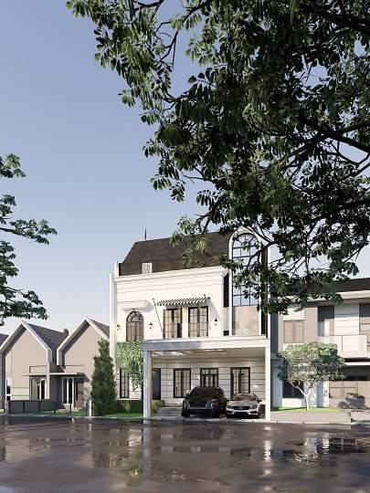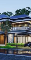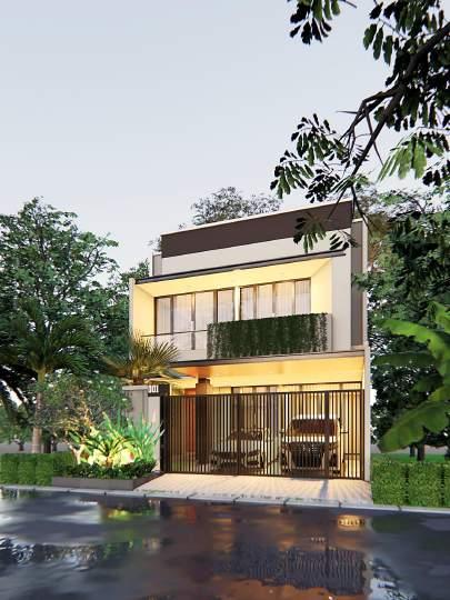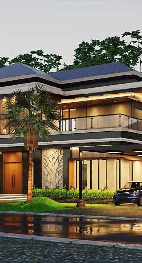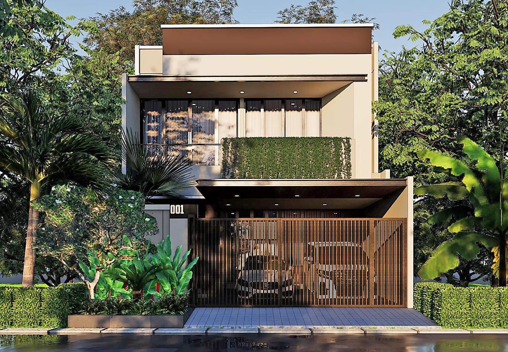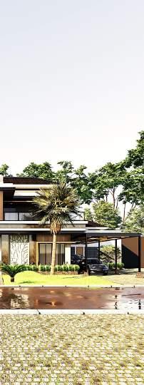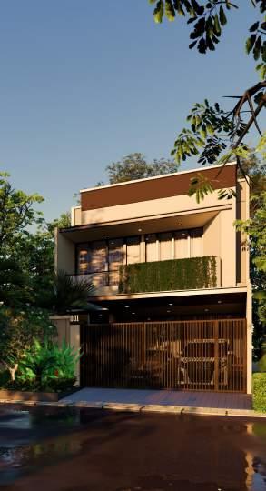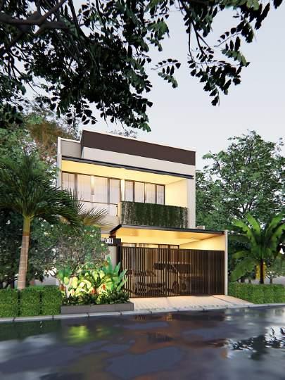 warna netral seperti abu-abu tua, putih, dan coklat kayu, yang dikombinasikan dengan pencahayaan hangat untuk menambah kesan mewah. Taman depan dilengkapi dengan pepohonan kecil, palem, semak, dan rerumputan yang dirancang secara rapi, memberikan kesan asri dan sejuk.