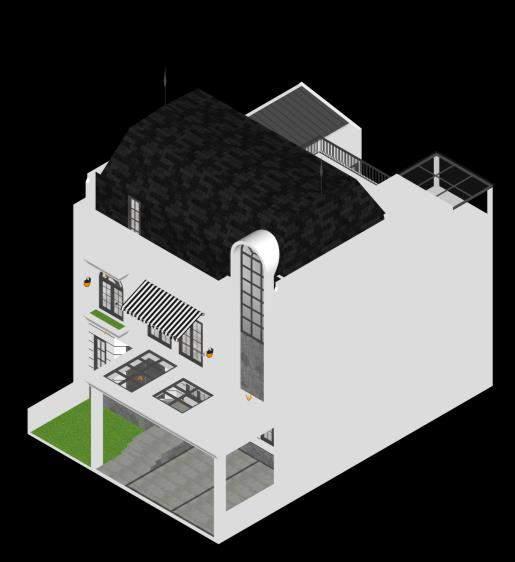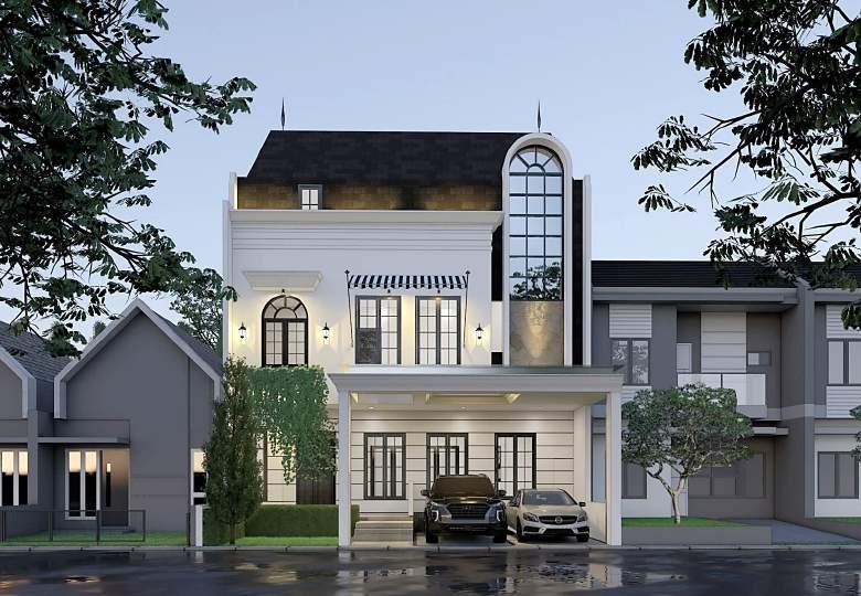 frame hitam memberikan kesan tegas dan modern, sementara lengkungan pada jendela lantai dua
