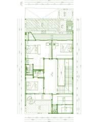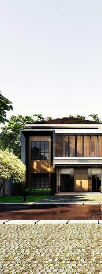 Panel kayu vertikal pada lantai dua dan aksen di dinding memberikan kehangatan visual. Didominasi oleh warna-