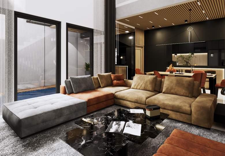 dapur berada dalam satu area terbuka tanpa sekat masif, menciptakan kesan luas dan menyatu. Sofa besar berbentuk L