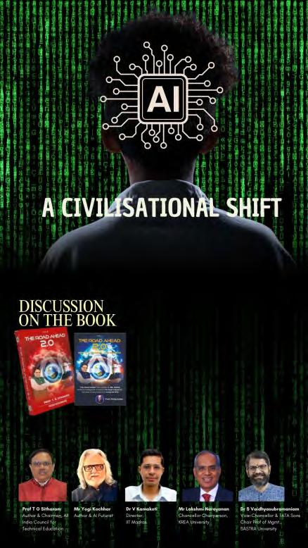 MMA and SASTRA University jointly organised a discussion on the book “The Road Ahead 2.0”, authored by Prof. T. G. Sitharam ﴾Chairman, AICTE﴿ and Yogi Kochhar ﴾AI Futurist﴿. The session was moderated by Dr. S. Vaidhyasubramaniam, Vice‐Chancellor of SASTRA Deemed University & TATA Sons Chair Professor of Management. Along with the authors, Lakshmi Narayanan, Chancellor & Chairperson, Governing Council, KREA University participated in the panel discussions.