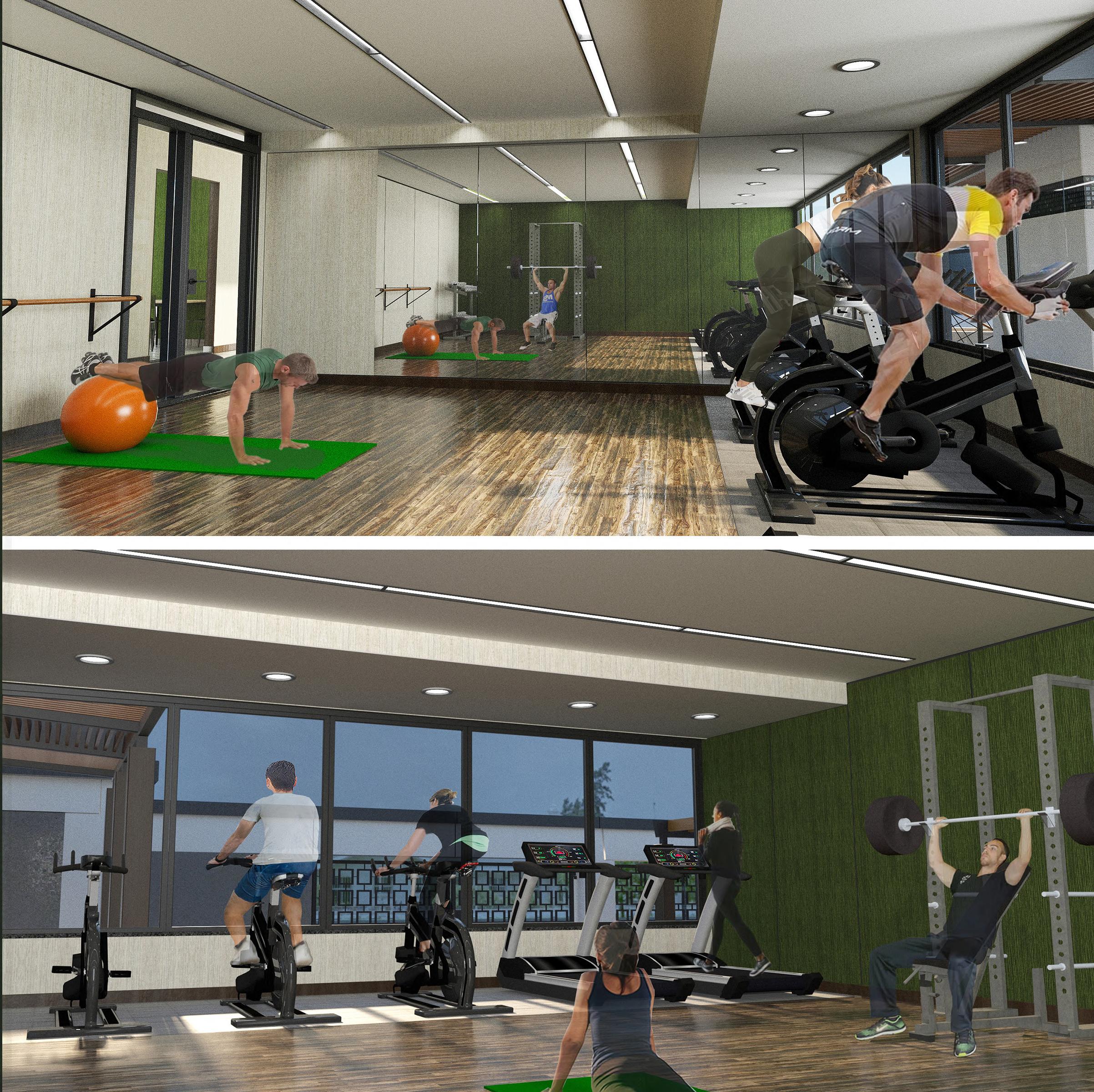 Gimnasio is a space designed for weight lifting, stretch area, has a mirrored wall, spin bicycles, and tread mills. Views to the outside provide natural light into space, as well as controlled interior lighting per station.
