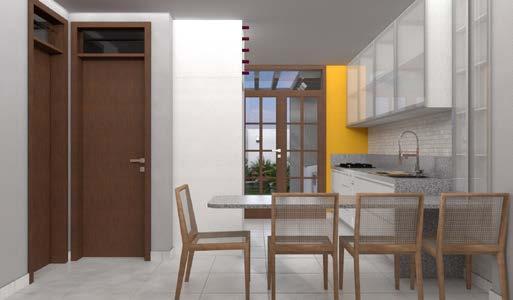 Sinônimo de energia, o amarelo traz sensações estimulantes e positivas dentro dos ambientes, trazendo a sensação de vitalidade, alegria e motiva a comunicação, além colaborar com a iluminação e amplitude de espaços pequenos (TokEmCasa, 2021). Por ser um espaço integrado, foi escolhida a cor Doce de Cajá da Suvinil, para trazer pontos de cores na sala e cozinha para que tragam vitalidade ao espaço e estimulem a interação (Figura 48 e 49). As aberturas dos vãos das janelas, já apresentadas na planta de demolição, contribuem também para maior iluminação natural dos ambientes. Além disso, pelo amarelo ser uma cor vibrante utilizou-se também a cor Ar Refrescante da Suvinil, juntamente com o mobiliário amadeirado e com cores mais neutras como o cinza e outros tons terrosos, para trazer mais harmonia e equilíbrio ao ambiente, e não haver um excesso de estímulos visuais.