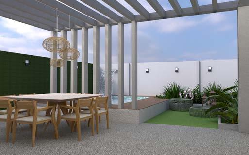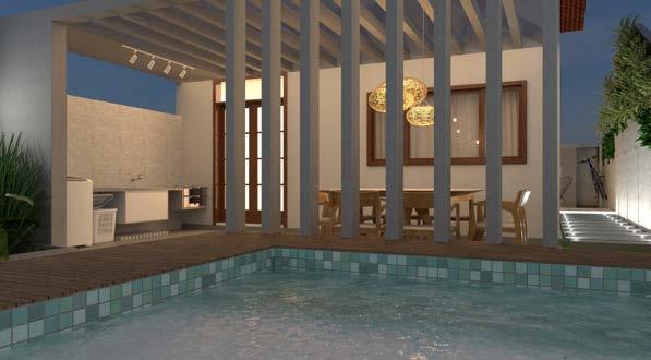 Ainda pensando na integração, a porta da cozinha integra todo esse ambiente de convívio interno à área gourmet no ambiente externo - onde antes era o quintal - com: uma área de serviço discreta e integrada a uma churrasqueira, um jardim com diferentes níveis e espécies de plantas, uma piscina em deck de madeira e com uma fonte, para agregar à experiência sensorial de Theo com barulho de água, aromas, cores e texturas diferentes (Figura 33).