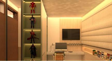 O quarto das crianças trazem layouts simples e padronizados: espaço para cama, espaço para guarda roupa e espaço para estudos. Devido a idade, o quarto do irmão mais velho (Figura 42) não tem área para brincar, pois a maioria de suas brincadeiras são na rua, como: andar de bicicleta e jogar bola. Por isso, na área de estudos, foi pensada uma área para televisão para lazer nos momentos em que estiver em casa.