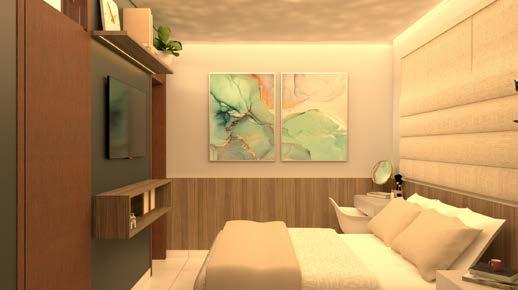 Por fim, a suíte dos pais (Figura 45) conta com um layout também simples, com cama, guarda roupa, painel de TV e uma penteadeira lateral.