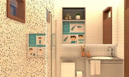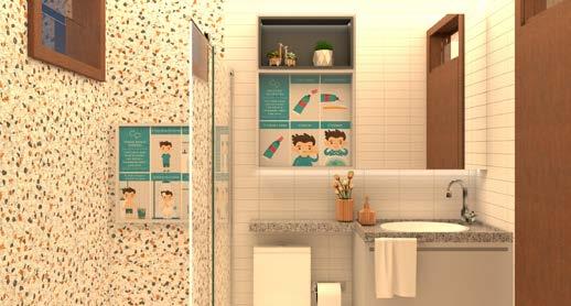 Por fim, o banheiro teve as dimensões e layout mantidos, com troca de revestimento e melhor aproveitamento da bancada (Figura 35). Além disso, conta com quadros de rotina, que auxiliam Theo a ser mais independente, como: passo a passo para escovação dos dentes, fazer as necessidades e tomar banho sozinho.