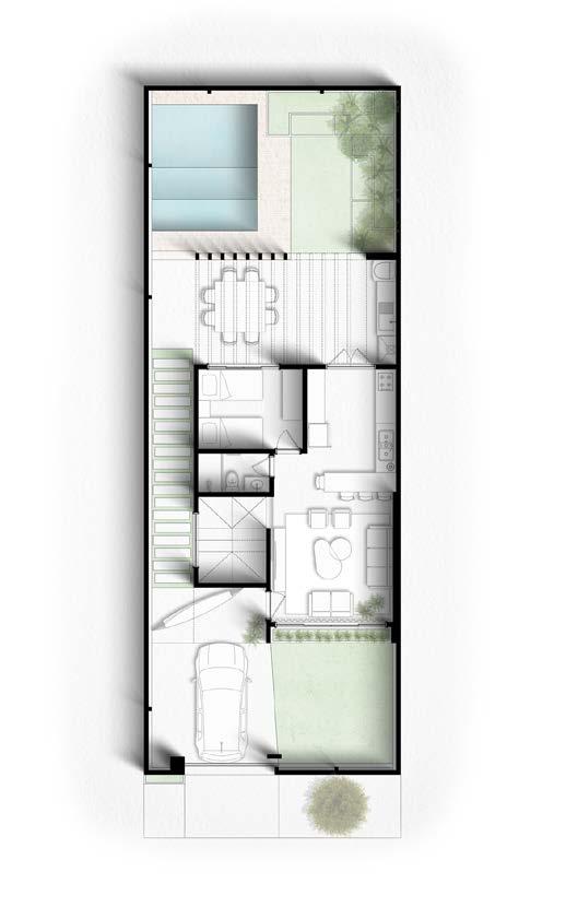 O jardim frontal, não tem layout previsto em projeto, para que a família crie esse uso junto, no dia a dia. Mas foi pensada a troca da pavimentação, para uma vegetação rasteira, mantendo apenas a área de garagem pavimentada frontal.