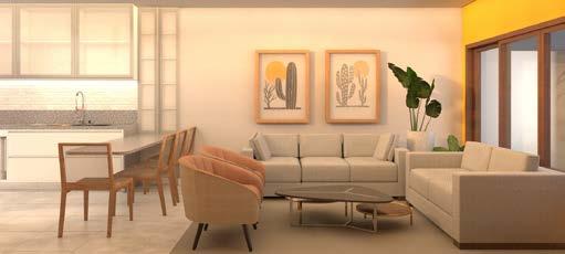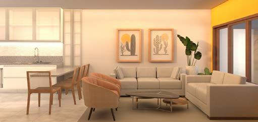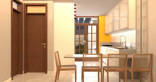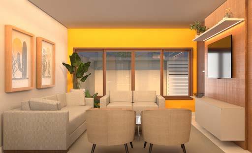 Sinônimo de energia, o amarelo traz sensações estimulantes e positivas dentro dos ambientes, trazendo a sensação de vitalidade, alegria e motiva a comunicação, além colaborar com a iluminação e amplitude de espaços pequenos (TokEmCasa, 2021). Por ser um espaço integrado, foi escolhida a cor Doce de Cajá da Suvinil, para trazer pontos de cores na sala e cozinha para que tragam vitalidade ao espaço e estimulem a interação (Figura 48 e 49). As aberturas dos vãos das janelas, já apresentadas na planta de demolição, contribuem também para maior iluminação natural dos ambientes. Além disso, pelo amarelo ser uma cor vibrante utilizou-se também a cor Ar Refrescante da Suvinil, juntamente com o mobiliário amadeirado e com cores mais neutras como o cinza e outros tons terrosos, para trazer mais harmonia e equilíbrio ao ambiente, e não haver um excesso de estímulos visuais.